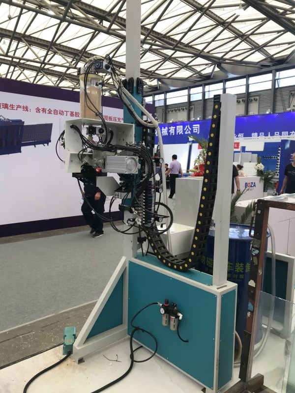자동 실링로봇을 위해, 기계적 머리는 기계 앞에 있습니다, 그 단계 유리를 생산할 때 그것이 겹창 유리넣기 생산 라인과의 실 커넥션을 달성할 수 있습니다.